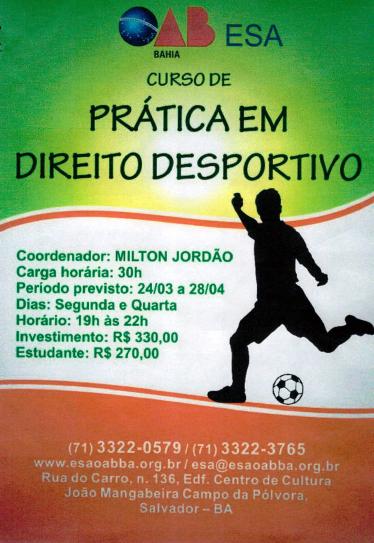Com aulas marcadas até o dia nove do próximo mês, as aulas do curso de Prática em Direito Desportivo serão ministrados na sede da escola, no Centro de Cultura João Mangabeira, Campo da Pólvora, ao lado do Fórum Ruy Barbosa.