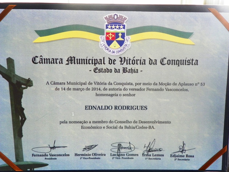 A nova função de destaque ocupada por Rodrigues no cenário estadual lhe rendeu mais uma homenagem. O mandatário da entidade máxima do futebol baiano recebeu mais uma moção de aplauso da Câmara de Vereadores de Vitória da Conquista.