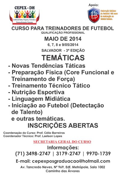 Esta será a 3ª edição do curso, que mais uma vez conta com o apoio da Federação Bahiana de Futebol. A novidade para esta edição é o Centro de Ensino, Pesquisa, Extensão e Desenvolvimento Humano (Cepex-DH), que assume o comando da qualificação profissional.
