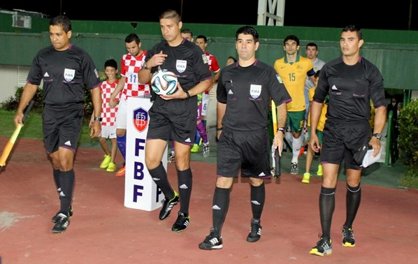Marielson, primeiro à direita, como 4ª árbitro do amistoso Croácia x Austrália (Foto: Carlos Santana/FBF)