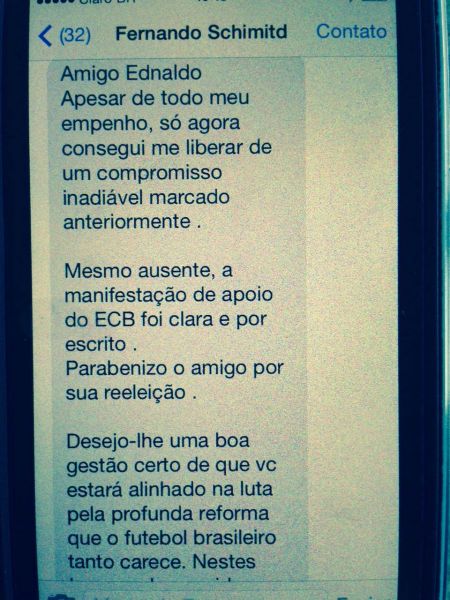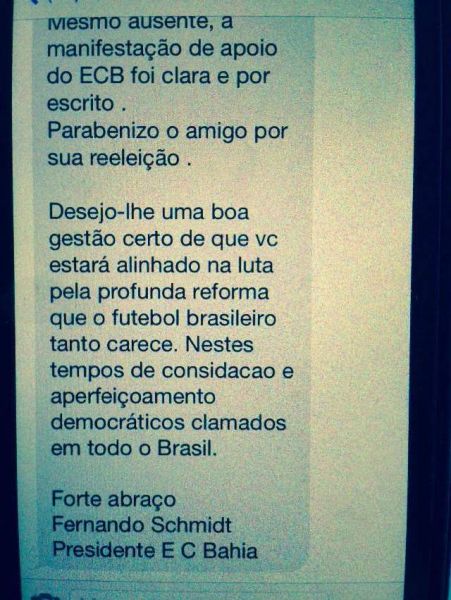 O presidente do Tricolor, Fernando Schimdt enviou uma mensagem de apoio a Ednaldo Rodrigues. “Amigo Ednaldo, apesar de todo meu empenho, só agora consegui me liberar de um compromisso inadiável marcado anteriormente. Mesmo ausente, a manifestação de apoio do ECB foi clara e por escrito. Parabenizo o amigo por sua reeleição. Desejo-lhe uma boa gestão certo de que você estará alinhado na luta pela profunda reforma que o futebol brasileiro tanto carece. Nestes tempos de considação e aperfeiçoamento democráticos clamados em todo o Brasil. Forte abraço. Fernando Schimdt, presidente E C Bahia”, escreveu.
