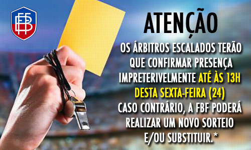 O Presidente da Comissão Estadual de Árbitros de Futebol da Bahia (CEAF/BA), Wilson Paim, solicita aos Srs. árbitros escalados que, ao tomarem conhecimento das suas escalas, imediatamente comuniquem-se com a FBF, através do telefone (71) 3321-0448 e/ou e-mail (fbf@fbf.org.br) para confirmar presença.