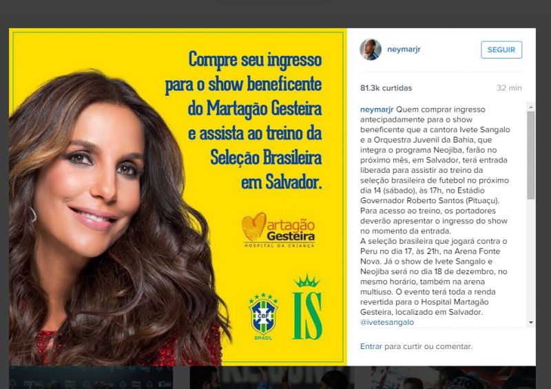 A campanha lançada pelo Governo da Bahia, através das Voluntárias Sociais, e a Federação Bahiana de Futebol (FBF) para incentivar os torcedores baianos a comparecerem ao Show Beneficente do Hospital Martagão Gesteira deu certo. A ação, em que cada pessoa que adquirir o ingresso para a festa, que contará com shows de Ivete Sangalo e Orquestra Juvenil da Bahia, do Neojiba terá acesso ao treinamento da Seleção Brasileira, ganhou o mundo.