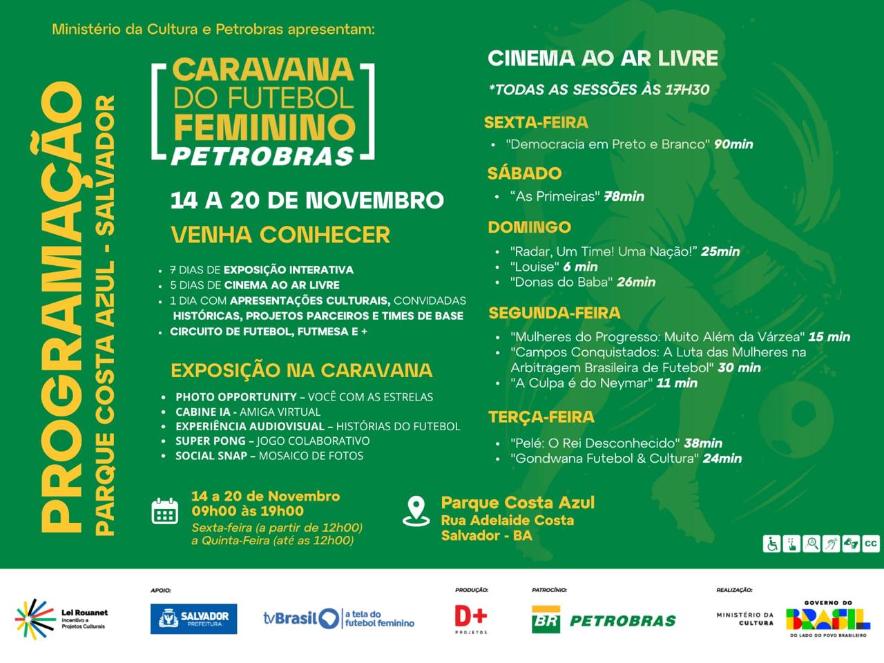 A Caravana do Futebol Feminino Petrobras chegou à Capital Baiana. O projeto, realizado pelo Governo Federal, por meio do Ministério da Cultura e a Petrobras, desembarcou em Salvador nesta sexta-feira (14) e ficará na cidade até o dia 20 de novembro, no Parque Costa Azul.