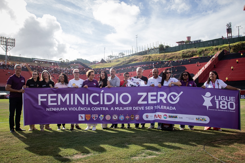 O jogo de estreia, entre Vitória e Atlético, no Barradão, marcou também o início da campanha de combate à violência contra a mulher e pelo feminicídio zero. A campanha é uma parceria do Governo do Estado com a Federação Bahiana de Futebol.