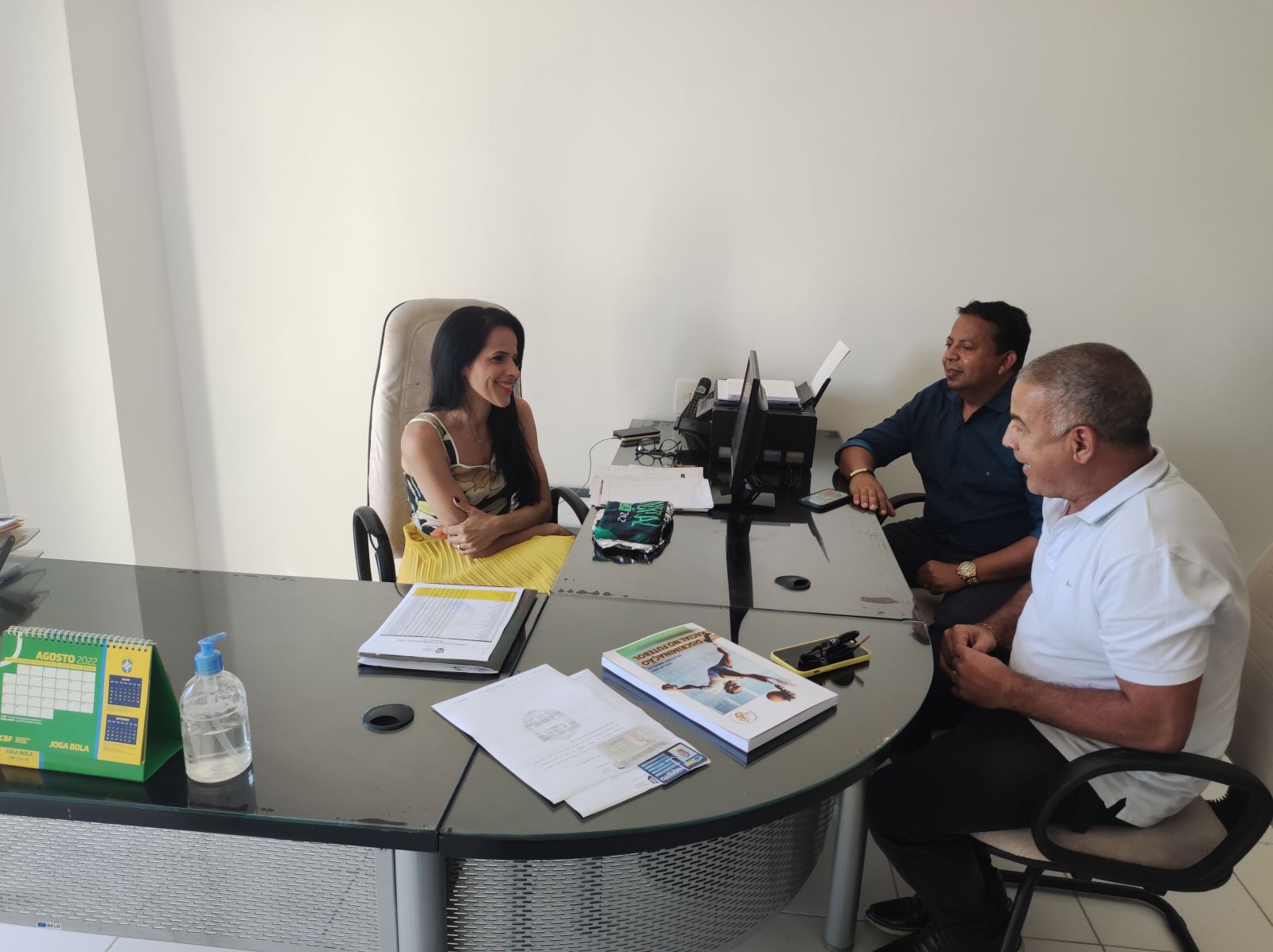 A Diretora de Competições da Federação Bahiana de Futebol, Taíse Galvão, comandou uma reunião sobre o futebol de Arataca, nesta quarta-feira (14). No encontro, a dirigente recebeu o Prefeito da cidade, Fernando Mansur, e o Secretário Municipal de Governo, Renato Freitas.