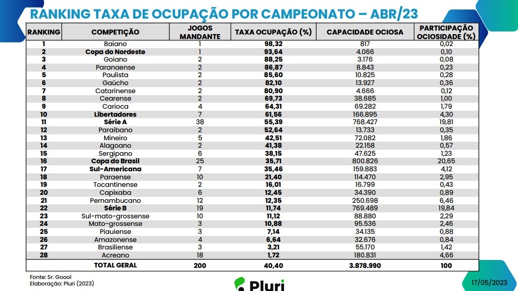 O Baianão apresentou uma taxa de ocupação de 98,3%. Completam o Top 5 a Copa do Nordeste, com 93,63%, Campeonato Goiano, com 88,24%, Campeonato Paranaense, com 86,87%, e Campeonato Paulista, com 85,59%.