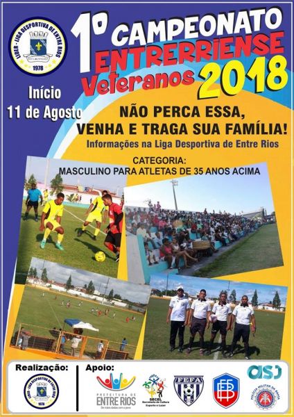 O Campeonato Entrerriense de Veteranos tem o apoio da Federação Bahiana de Futebol e da Prefeitura Municipal de Entre Rios. "Para nós como gestão, é uma satisfação apoiar o 1° Campeonato Entrerriense de Veteranos 2018, pois esta competição de futebol prestigia nossos ex-atletas e também atletas amadores que ainda estão em atividade, vestindo a camisa de seus clubes das associações desportivas, que merecem nossa atenção. Esperamos contar com um grande número de participantes e torcida, mostrando assim a força do esporte de Entre Rios. Boa sorte a todos os envolvidos nesse grandioso e inovador projeto esportivo", disse o secretário de Cultura, Esporte e Lazer, Josemar Florêncio.