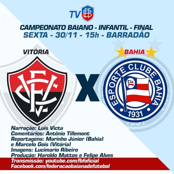 A decisão do Campeonato Baiano da categoria Infantil acontece nesta sexta-feira (30), às 15h, no Estádio do Barradão. Como venceu o jogo de ida, em Pituaçu, por 1 a 0, gol de João Pedro, o Bahia para ser campeão joga pelo empate contra o Vitória, que precisa vencer por um gol de diferença para levar a decisão para os pênaltis ou por dois para ficar com o título no tempo normal. O clássico terá transmissão exclusiva da TV FBF.