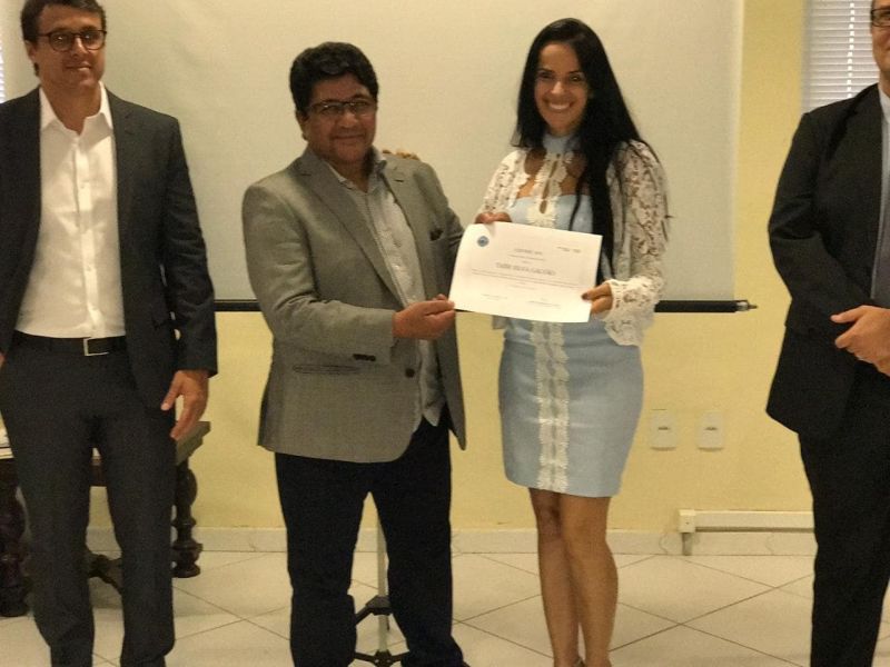 A diretora Taíse Galvão recebe o certificado do curso de Ednaldo Rodrigues