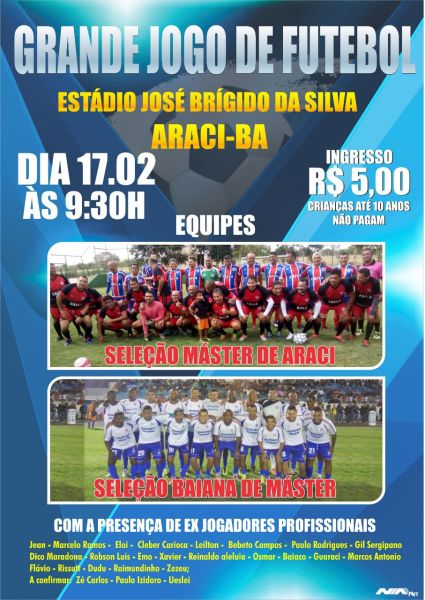 Às 9h30, os ex-craques do futebol baiano enfrentam a Seleção Máster da cidade, no Estádio José Brígido da Silva. Os ingressos para a partida custam R$ 5. Crianças até dez anos não pagam.
