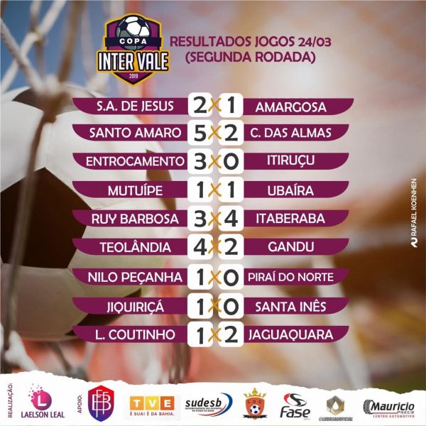Foram 9 jogos disputados no último domingo (24) pela segunda rodada da 6ª Copa Inter Vale de Futebol 2019 (Taça Lubrijau). A competição organizada pelo vereador de Ubaíra, Laelson Leal, conta com o apoio da Federação Bahiana de Futebol e tem a participação de 39 seleções.