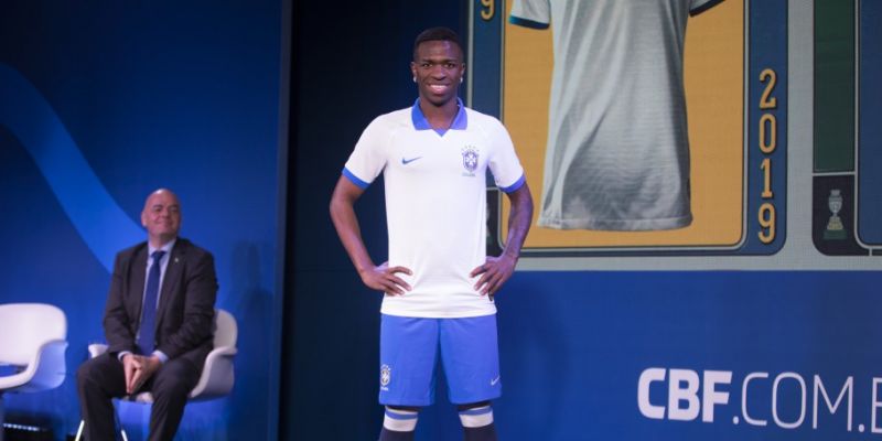 O atacante Vinícius Júnior, do Real Madrid, apresentou a camisa branca, uma homenagem aos 100 anos da primeira conquista da Copa América. Ela será utilizada pelo Brasil no primeiro jogo da Seleção, dia 14 de junho, às 21h30, contra a Bolívia, no Estádio do Morumbi, em São Paulo, pelo Grupo A.