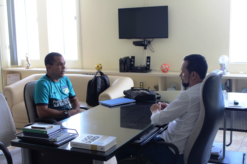O presidente da Federação Bahiana de Futebol recebeu a visita do idealizador e presidente do projeto social Divisão de Base de Árbitros de Futebol (DBAF), Rildo Gois. O dirigente e o árbitro se reuniram na sede da entidade.