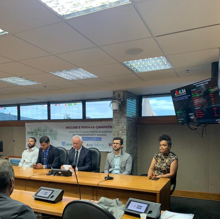Intitulada "Mais Políticas e Fortalecimento do Paradesporto", a Audiência Pública foi presidida pelo Deputado Estadual Bobô e contou com presenças de outros deputados, autoridades e profissionais do esporte e da imprensa.