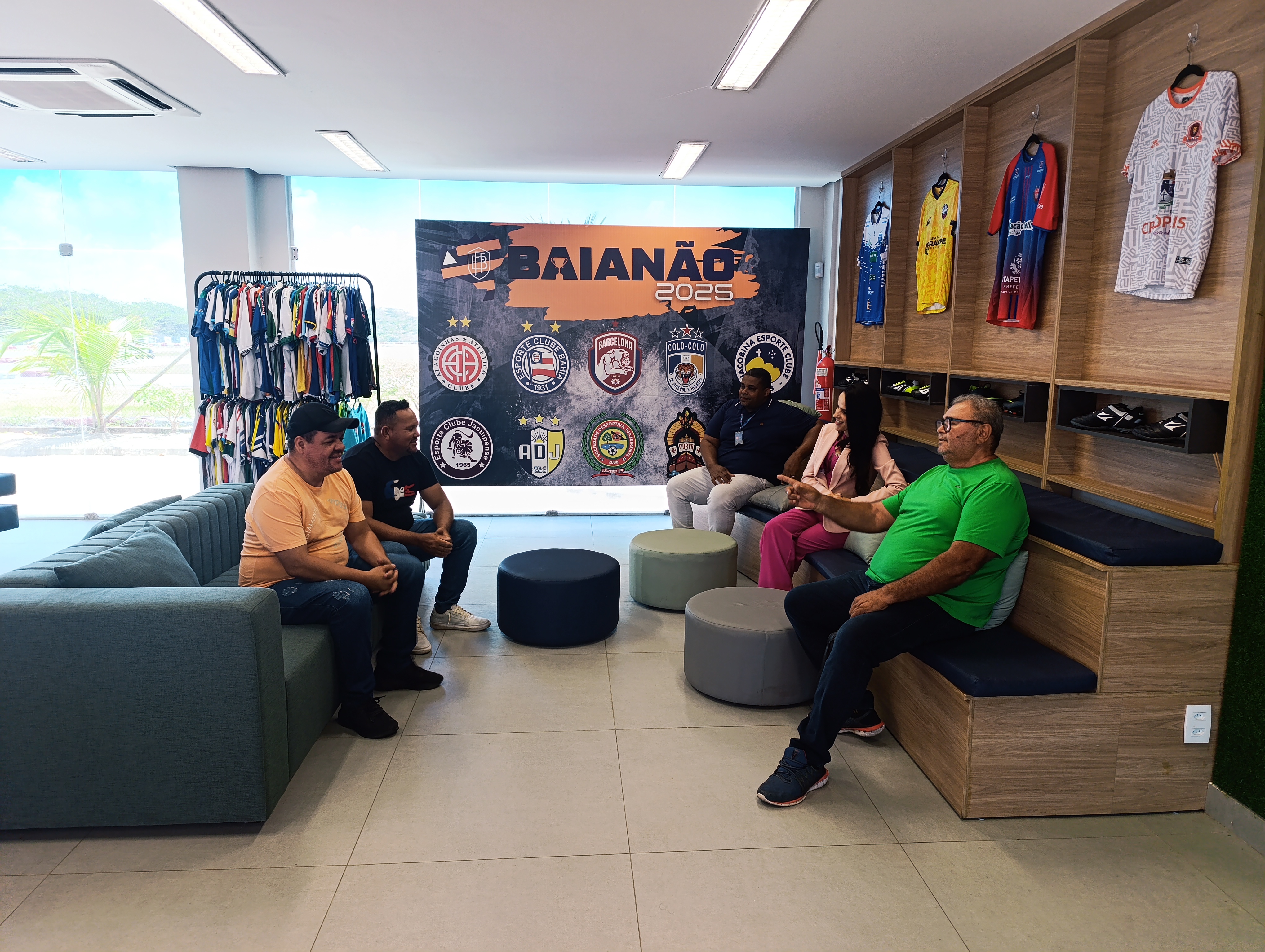 Uma comitiva de Jeremoabo esteve na sede da Federação Bahiana de Futebol nesta quarta-feira (29). O presidente da Liga Jeremoabense De Futebol, Eraldo Silva, o presidente da Associação Atlética Água Branca, Israel Oliveira, e colaborador da liga, Fábio José de Matos, se reuniram com a diretora de competições da entidade, Taíse Galvão.
